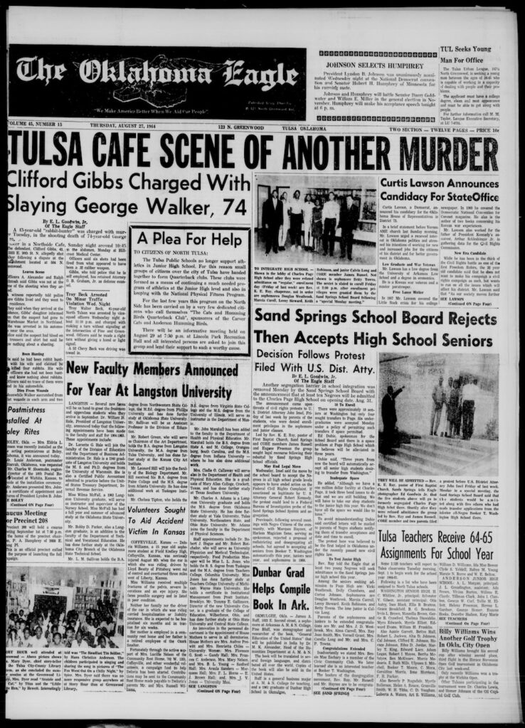 Tulsa public schools would remain segregated until the early 1970s, (forced to integrate after a then-young lawyer, James O. Goodwin – our publisher – initiated the first desegregation lawsuit in the City of Tulsa resulting in school desegregation.)